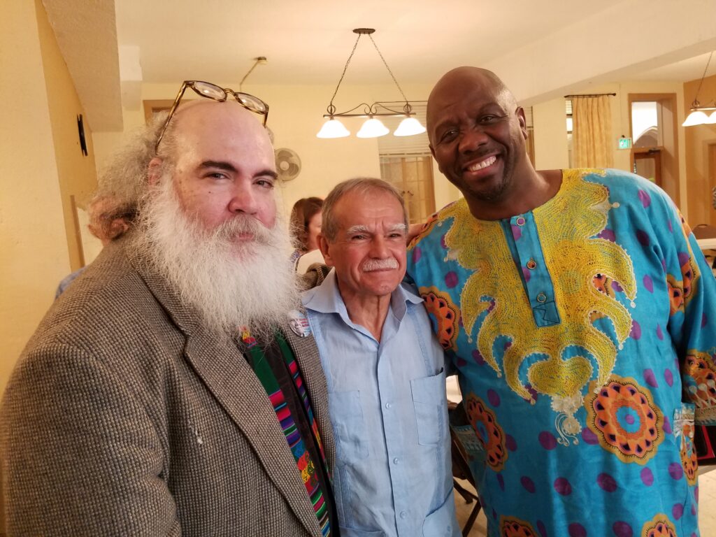 Photos courtesy of Matt Meyer: (1) Matt Meyer, Oscar López Rivera, and Rev. Kelvin Sauls; (2) Rev. Oliver Buie and Oscar López Rivera embrace, with Matt Meyer onlooking.