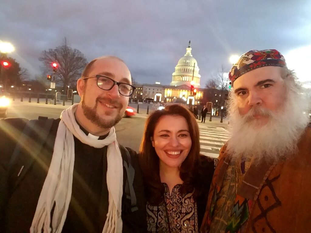 Photos: (1) Poor People’s Campaign Co-Chairs Dr. Theoharis (left) and Dr. Barber meet with FOR National Council Co-Chair Matt Meyer and NC member Chrissy Stonebraker-Martinez in Nashville this March (courtesy Matt Meyer); (2) Meyer and FOR NC Co-Chair Sahar Alsahlani meet with PPC Faith Community Organizer Rev. Stephen Knight in Washington this February (courtesy Stephen Knight); (3) Dr. King (fair use image); (4) PPC banners light up the Moral March in Raleigh NC this February (courtesy Ethan Vesely-Flad).