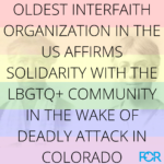 FOR IMMEDIATE RELEASE Contact: Ariel Gold | FOR-USA executive director | gro.asurofobfsctd-12eace@dlogleira | 510 599 5330 Sunday, November 20, 2022 – In the wake of a mass shooting at the Club Q nightclub in Colorado, the oldest interfaith peace and