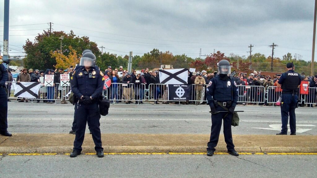 We proceeded Saturday to Shelbyville with not enough sleep. As everyone knows, the overwhelming counter-demonstration drowned out the hate rally pretty effectively, And amidst all of the chanting, screaming, and playing of “La Bamba” from our side, I listened carefully to the speeches from the other side of the bridge.