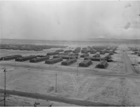 [Images: (1) Gordon Hirabayashi, Presidential Medal of Freedom, photographed during Courage in Action: the Life and Legacy of Gordon K. Hirabayashi. Courtesy of Creative Commons; (2) Panoramic view of Central Utah Relocation Center, Francis Stewart, 1943, National Archives and Records Administration]