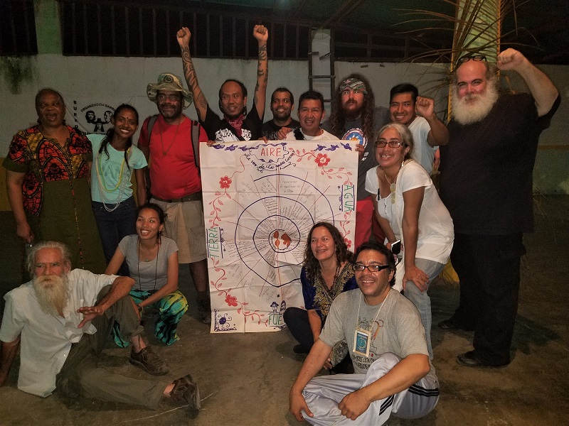 Photos courtesy of Matt Meyer: (1) The First Ecosocialist International official poster: Weaving Us to Mother Earth; (2) International delegates from Kurdistan and Kenya speak with reknowned Peruvian indigenous rights activist Hugo Blanco; (3) Conference poster, with focus on Trueke, the successful barter system being used by grassroots peoples; (4) The Sub-committee (Spiral) on Air:  including organizers from East Africa, Indonesia, the Lakota people of Standing Rock, and FOR’s Matt Meyer.